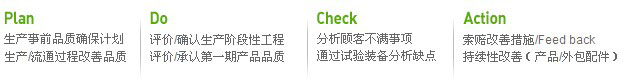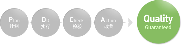 品質保證過程由計劃(Plan)、實行(Do)、檢驗(Check)、改善(Action)等所位P.D.C.A階段構成,這樣的反復 性實行進一步強化競爭力。